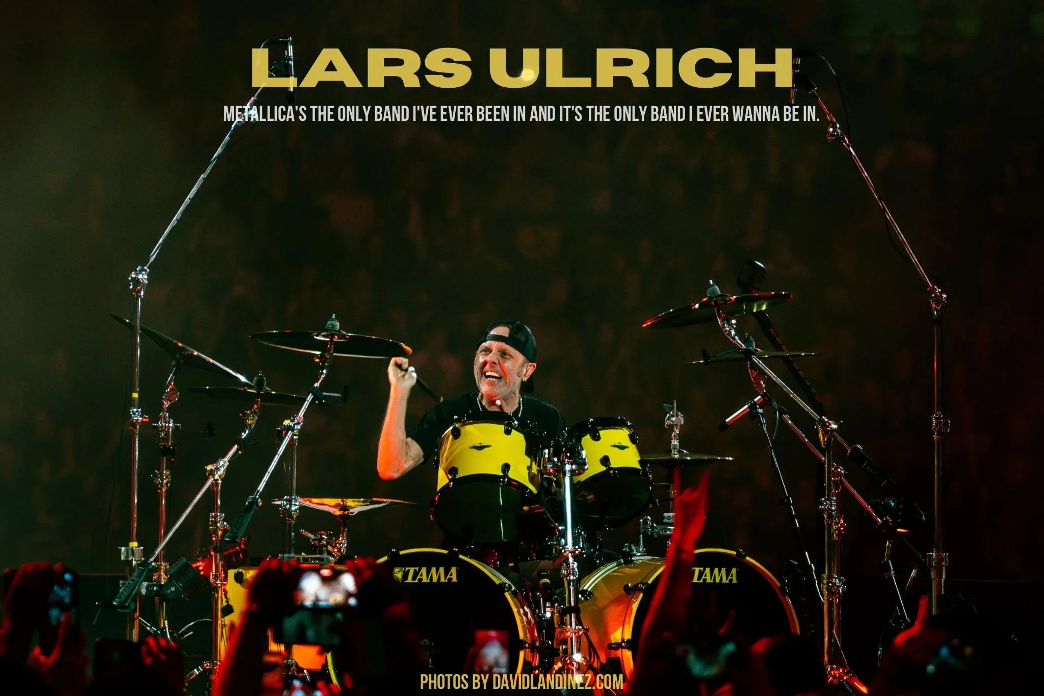 A drummer performing at a concert, with the text 'LARS ULRICH' and a quote about Metallica overlayed at the top.