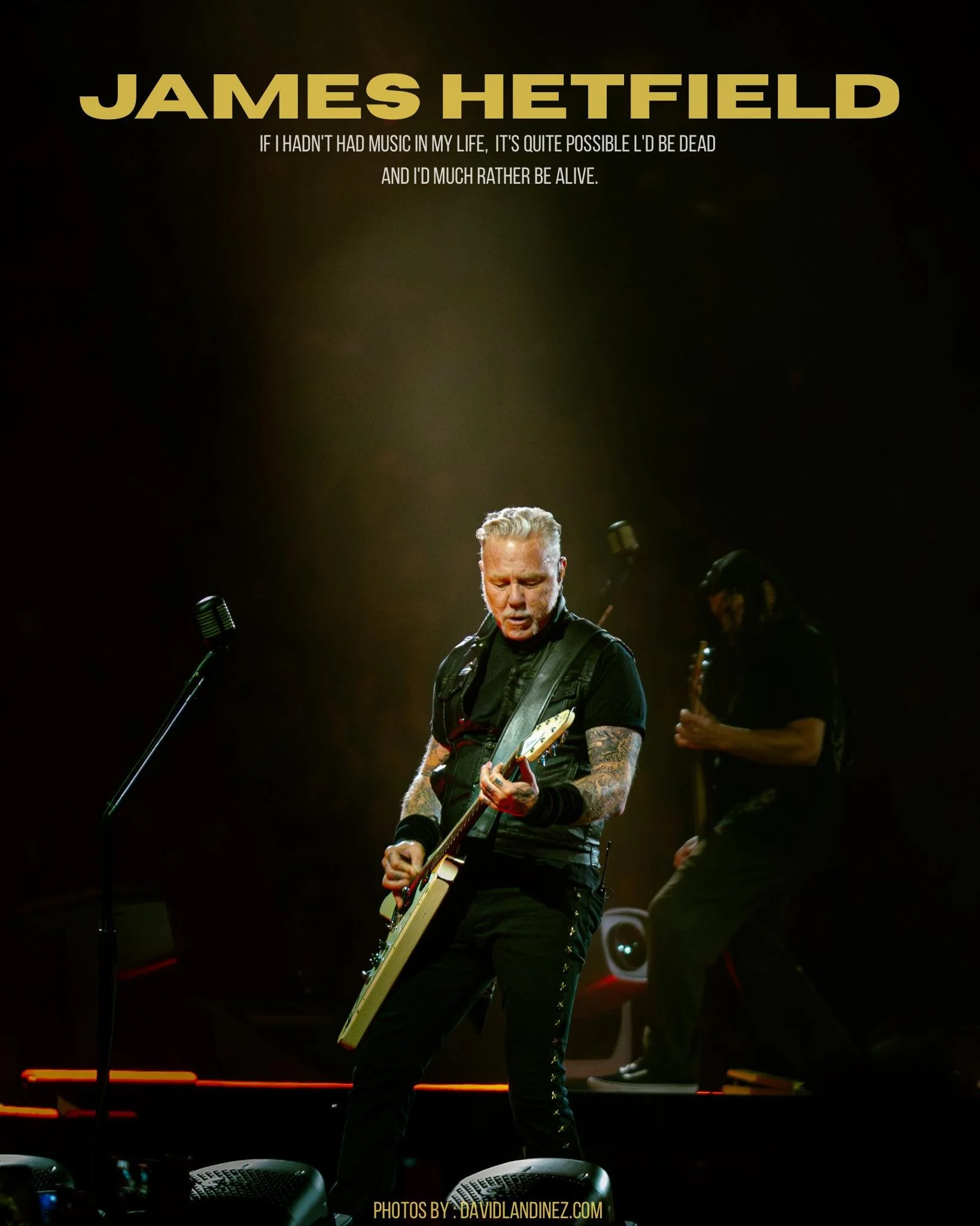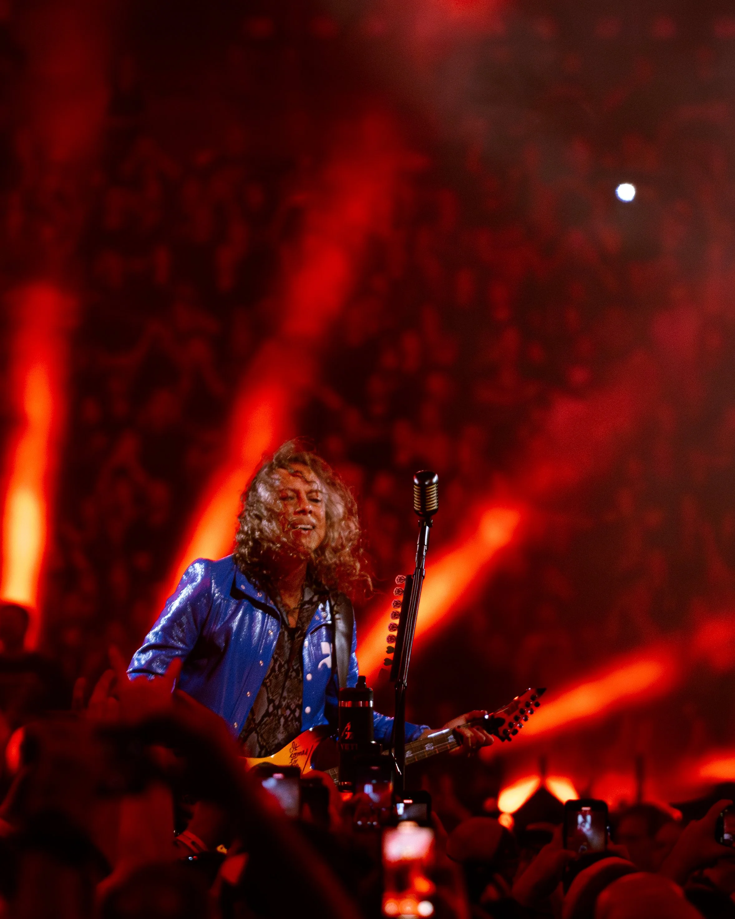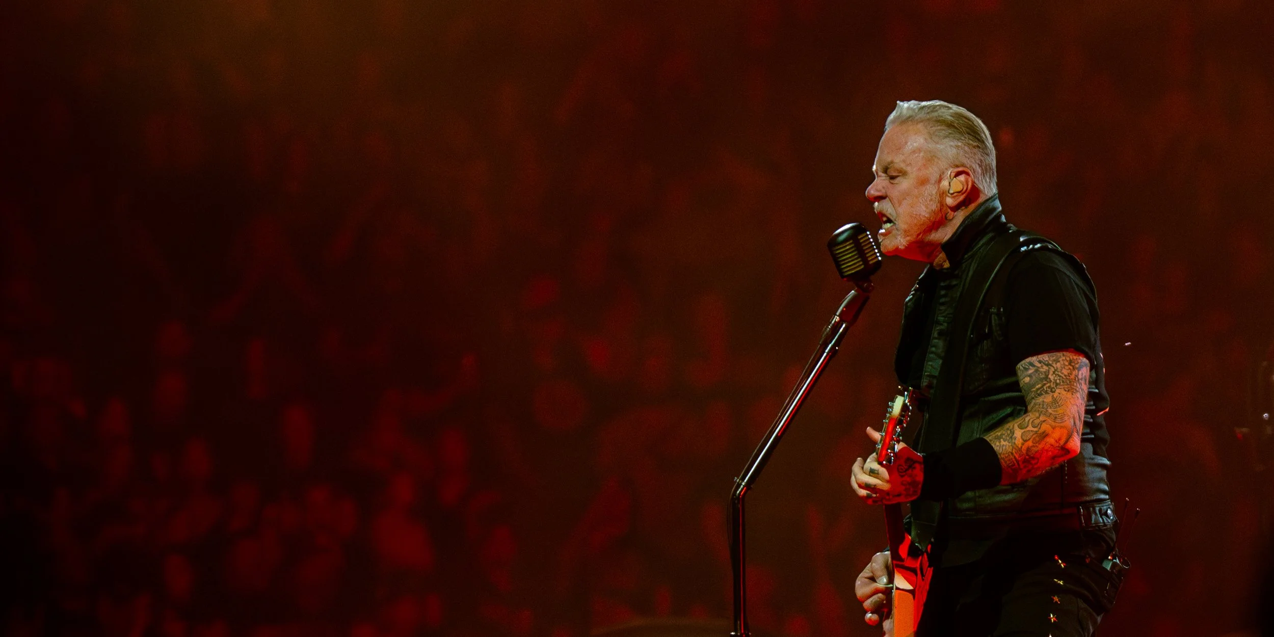James Hetfield performing live on stage with a guitar, with another musician playing a guitar in the background, under concert lighting.