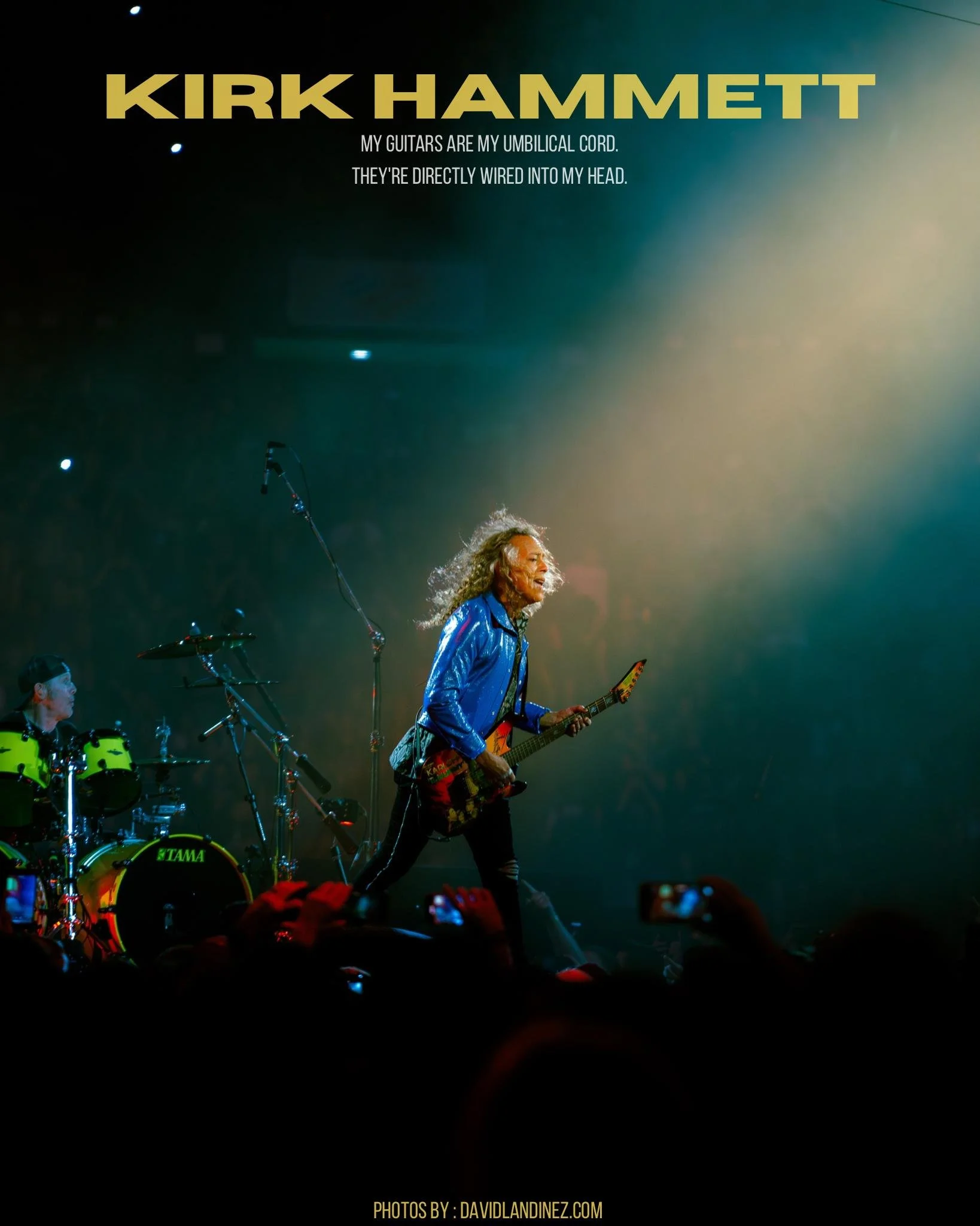 Kirk Hammett performing on stage with a guitar, a drummer in the background, and concert lighting. Text overlay reads "Kirk Hammett" and includes a humorous quote about guitars as an umbilical cord.