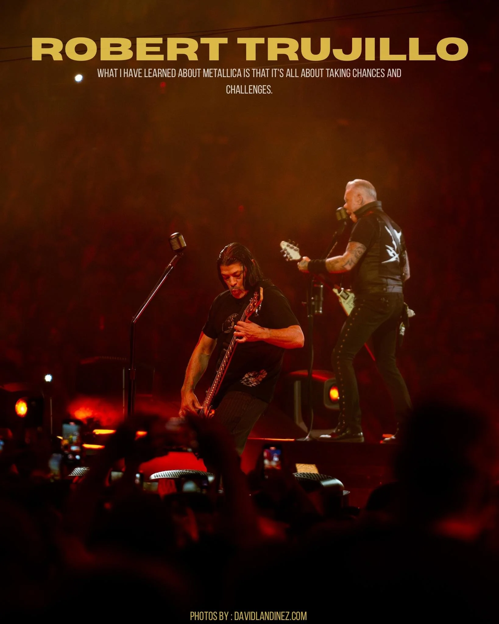 Two musicians performing on stage during a concert at night, with red lighting and an audience taking photos. One is playing guitar and the other is playing bass guitar. The text overlay mentions Robert Trujillo, a member of Metallica, and a quote ab